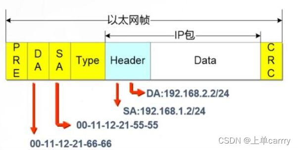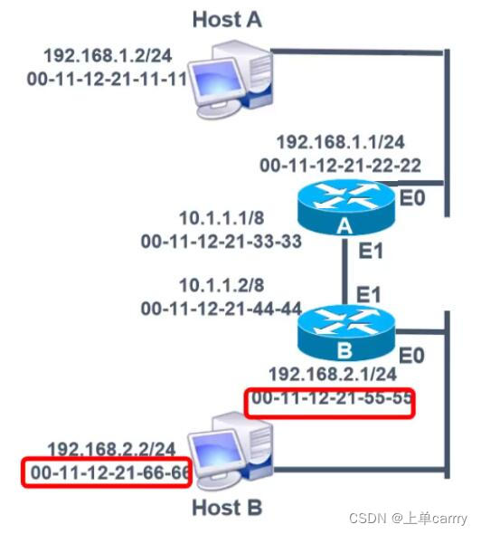 2. 主机A利用ARP进入默认网关路由器A与MAC地址00-11-12-12-21-21-22-22的E0接口。IP包包被包裹在以太网数据框中 数据链主机A层的以太网数据框中Tetha框架源MAC地址的第一部分是11-11。与MAC地址22-22的E0网关接口是MAC预定地址。