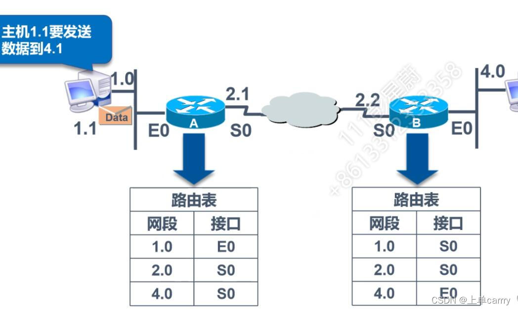 3. 路由器A从E0接口接收数据框架,并删除数据链层的密封。路由器A搜索自己的路由器列表,找到与目标地址相符的路线列表项目,然后根据路由器表的下一个跳跃器地址将数据包发送给E1接口。