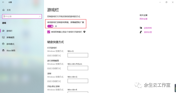 第三步,当我们访问计算机游戏设置界面时, 我们确定界面右侧的功能, 使用播放栏记录游戏剪辑、 图像和广播, 然后打开它, 并翻转开关蓝色, 以表示函数成功打开 。