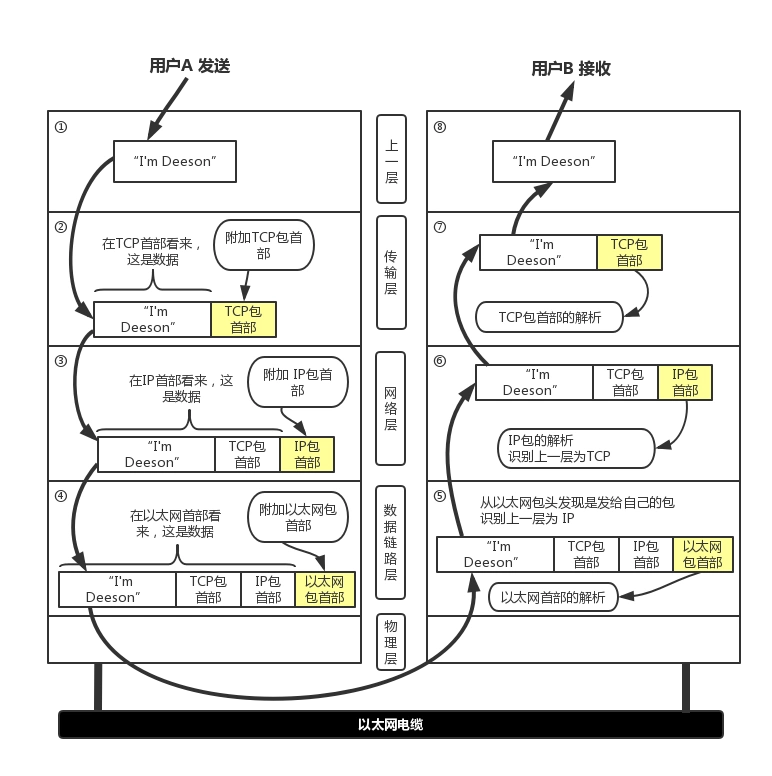 来自 IP 的 IP 软件包是 以太网 的数据 。 数据附在 以太网 顶端并交付处理, 由此产生的以太网 数据包则通过 IP 的 物理层 IP 软件包发送到接收端 。 数据附在 以太网 顶端并交付处理, 由此产生的以太网 数据包则通过 物理层发送到接收端 。