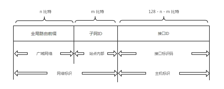 - 如下图所示,IPv6网络目前使用的格式为 n= 48, m = 16, 128 - n - m = 64. 这是网络标识之前的64位和之后的64位。