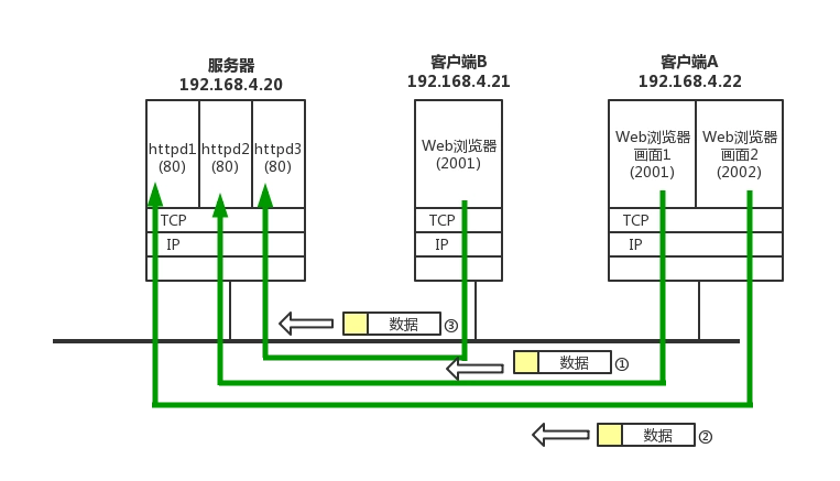 - 通信1和2由两台计算机进行,两台计算机的目标号码相同,均为80,可通过源港口号确定。