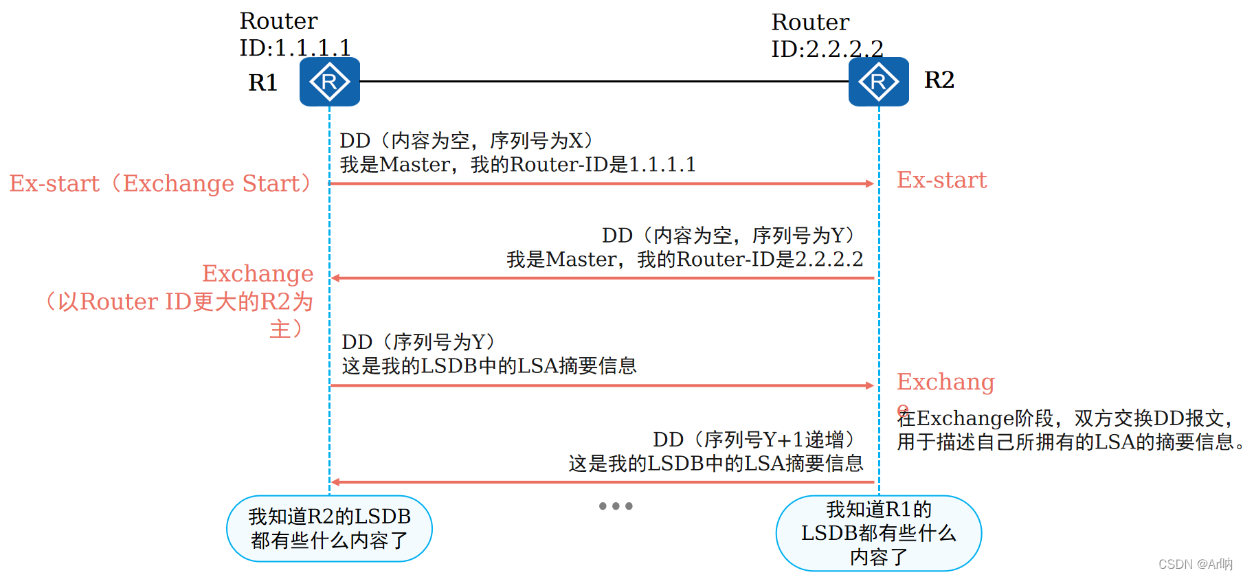 2. DD信息:用于传递链接国家数据库(LSDB)中汇总的信息:为了避免整个LSDB过长,造成设备CPU资源和带宽捕获耗竭,提供简要信息,简要总结LSA关键识别点。