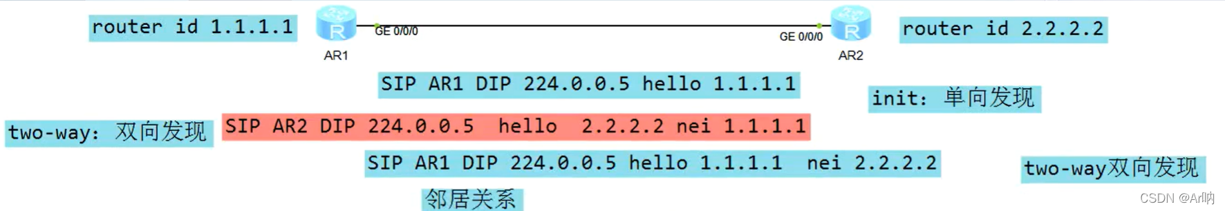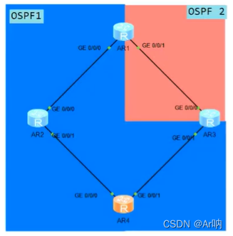 在上图中,AR1的g/0/0和AR2的g/0/0属于同一网络部分,无论两个接口进程数字是否相似,都可以建立邻接关系。