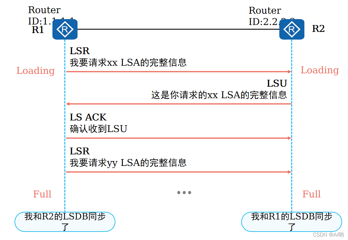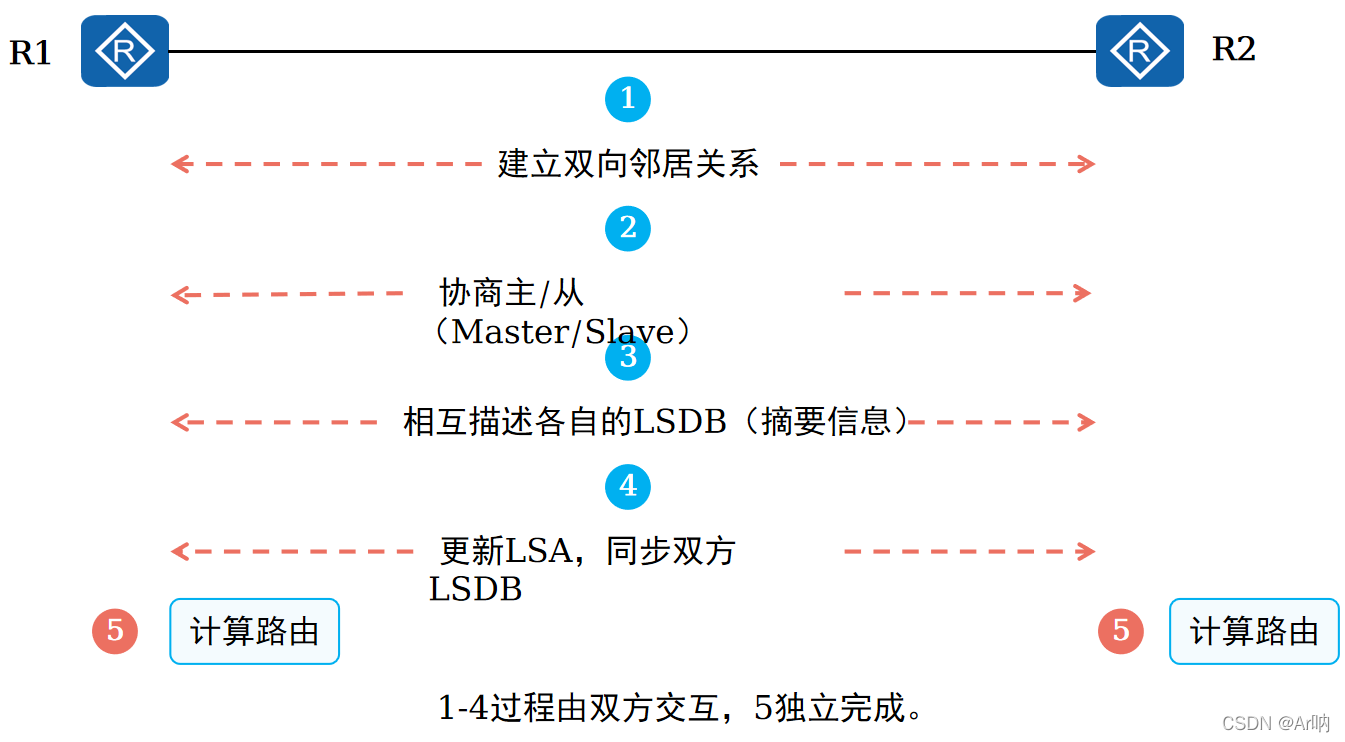 建造邻里关系只是上文提到的DD、LSR、LSU和LS ANK等一系列信息交换的开端。 当两个路由器LSDB同步并开始独立计算路线时,它们建立了相邻关系。