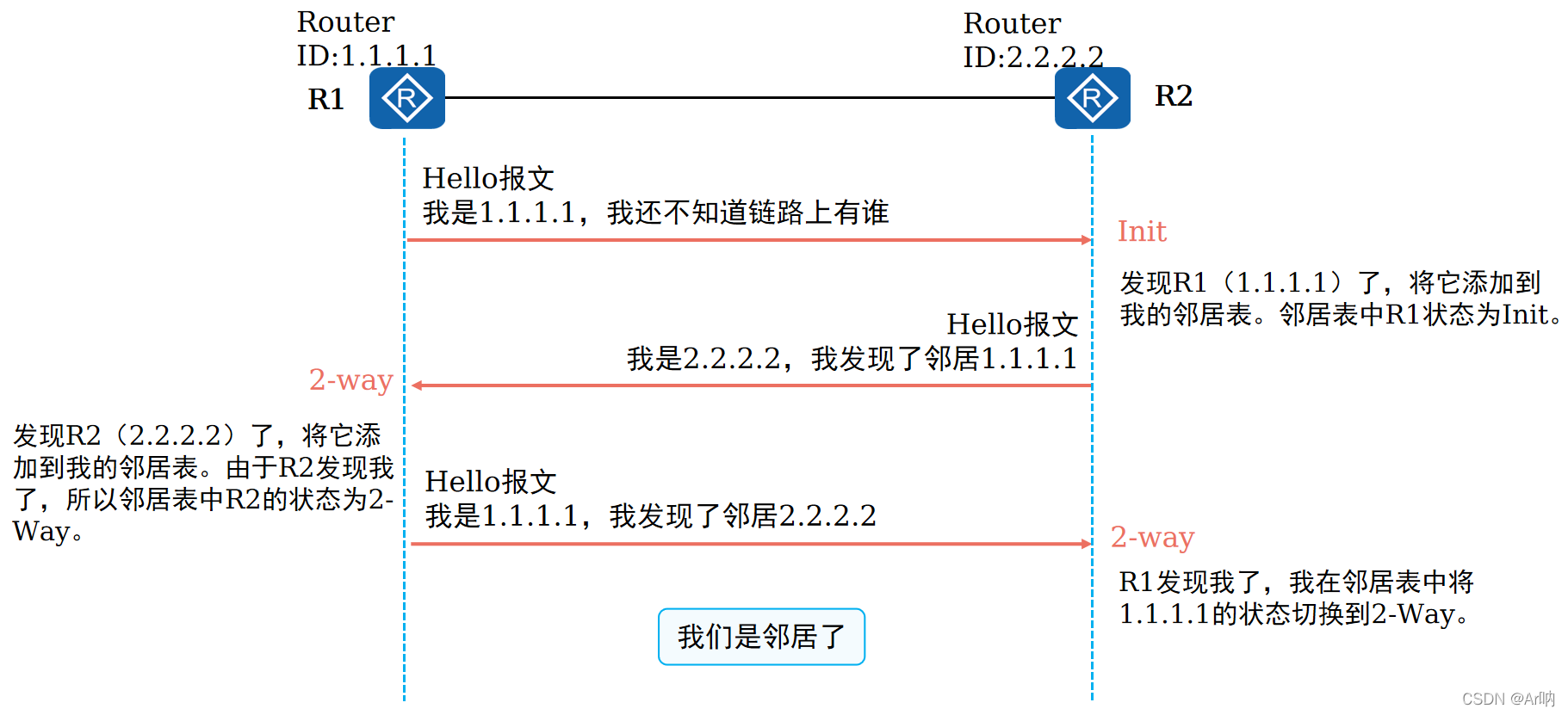 想象一下一个有两条直线路由器的简单顶端。 OSF在双方的界面上工作,路由器开始发送和收听 Hey 的讯息。 这两条路由器在通过Hellolo 报纸见面后建立了一个街区。