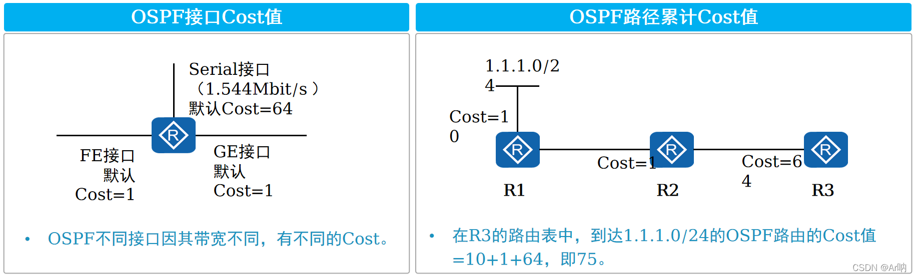成本(成本)是OSPF使用的测量方法。每个激活 OSF 的界面 都会为该界面保留成本值 。接口成本 = 默认值 = 默认值接口带宽100兆比特/秒(千兆比特/秒)默认情况下,参考带宽/实际带宽比率为100百万比特/秒。对不起,但我不确定,其中100百万比特 定义了OSF的默认参考值,这些是可定制的。