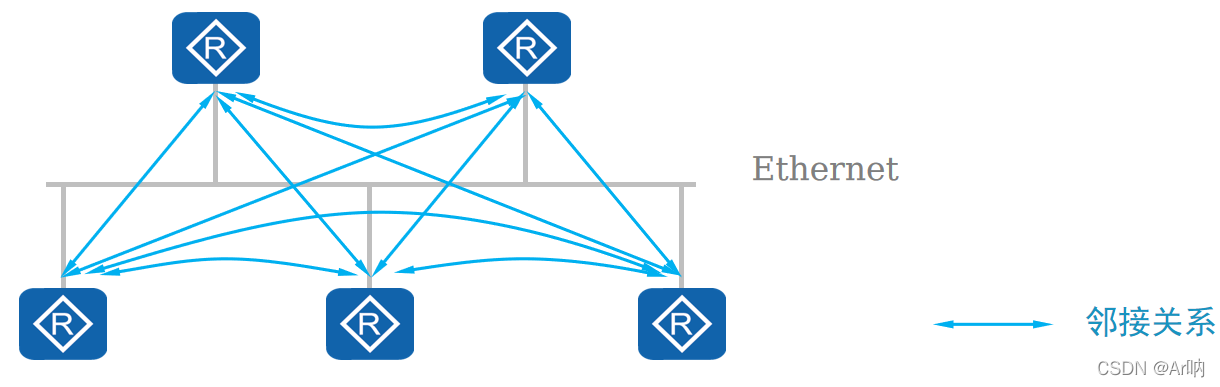 如果MA网络中每个OSPF路由器都靠近所有其他路由器,这可能导致OSPF在网络中过于接近,设备负荷增加,以及OSPF洪水报告在网络中增加。