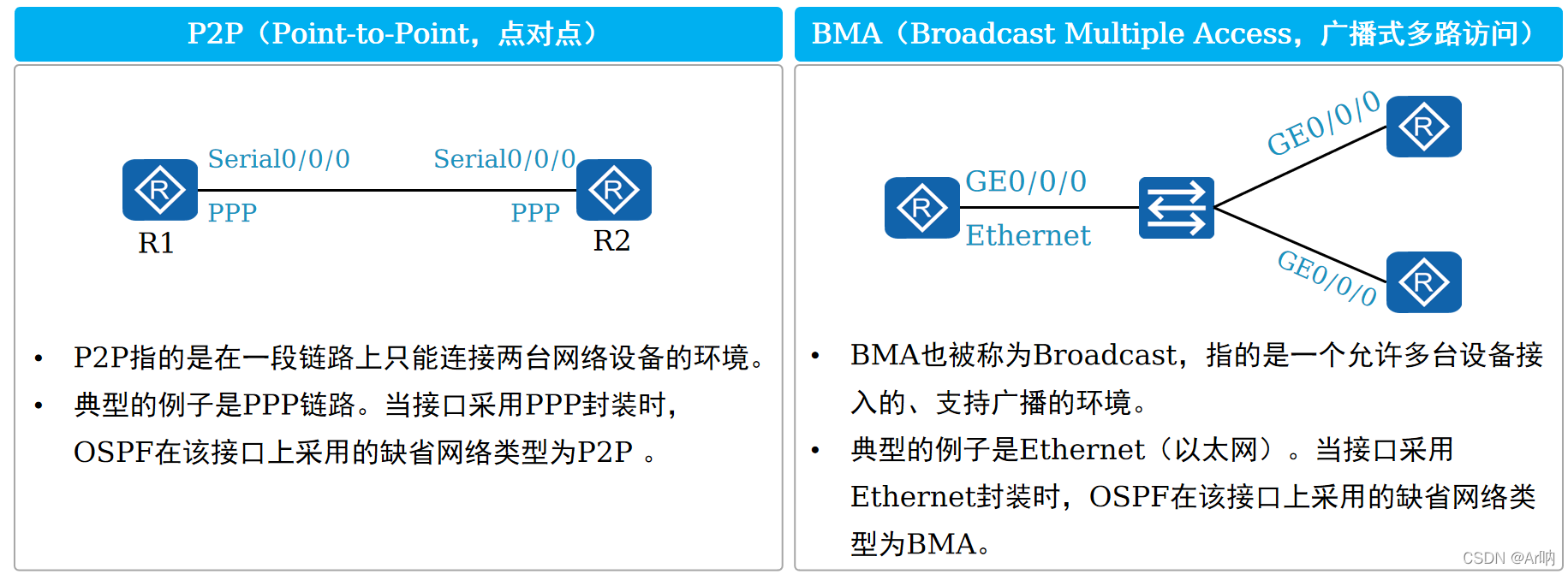 广播多常规接入网络(BMA)和非广播多常规接入网络(NBMA)是两种MMA(Multi-Access)多常规接入网络,以太网是广播多路接入网络的一个实例。
