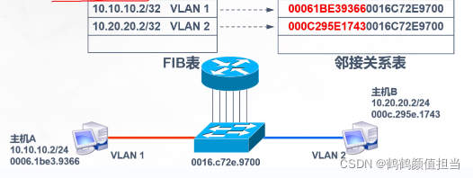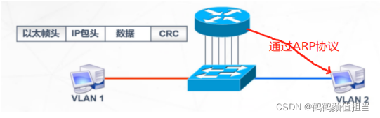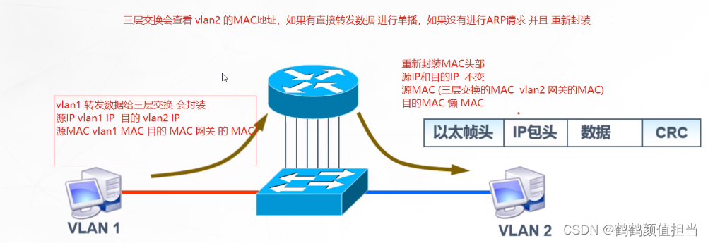 三层交换机上,第三层引擎处理数据流的第一个包;vlan1 转发给三成交换 会封装——>源IP vlan1 IP 目的 vlan2 IP——>源MAC vlan1 MAC 目的 MAC 网关的MAC;重新封装MAC头部——>源IP和目的IP不变——>源MAC三层交换的MAC(vlan2 网关的MAC)——>目的MAC vlan2 MAC