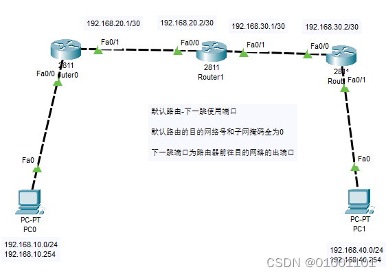 Router(config)#ip route 0.0.0.0 0.0.0.0 fastEthernet 0/1默认路线的目的地编号和子网掩码均为零。
