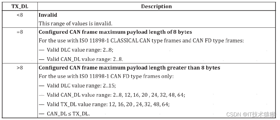有效的TX_DL值是使用8至15之间数据长度(DLC)值计算的(见ISO 11898-1:2015,DLC表)。