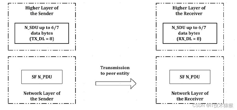 SF N_PCI使用单一的框架协议控制信息来识别SF N_PDU。发件人发送SF N PDU。一个或多个接收网络实体可以接收。为了发送一个业务数据模块,该模块被发运。可使用单一的服务请求将业务数据模块传送到数据链层。发送身份不明的短信