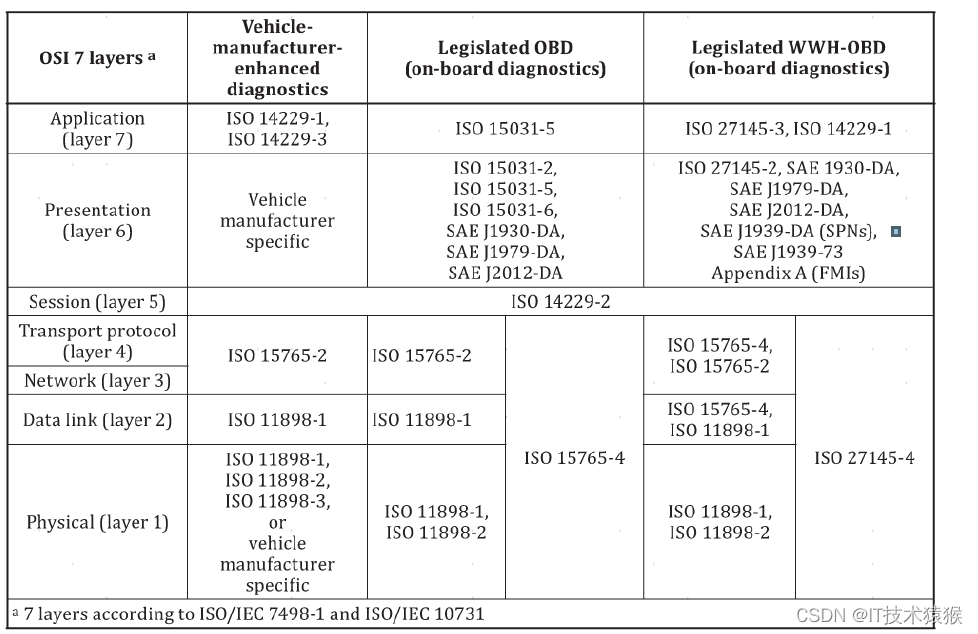 ISO 15765的这一节旨在为拟在区域控制器网络通信线路上实施的车辆诊断系统制定标准标准。根据ISO 11898-1。尽管它主要用于诊断系统,然而,它确实满足了为其他基于能力的系统制定网络一级的协议的需要。为了实现这一目标,它以ISO/IEC 7498-1和ISO/IEC 10731(OSI基本反应模型)为基础。通讯系统有七层如表1所示。