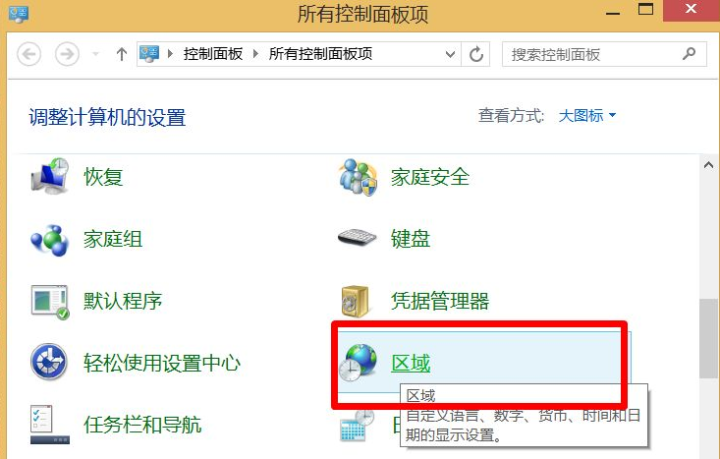 然后从接口中所有控制面板条目列表中选择区域条目。