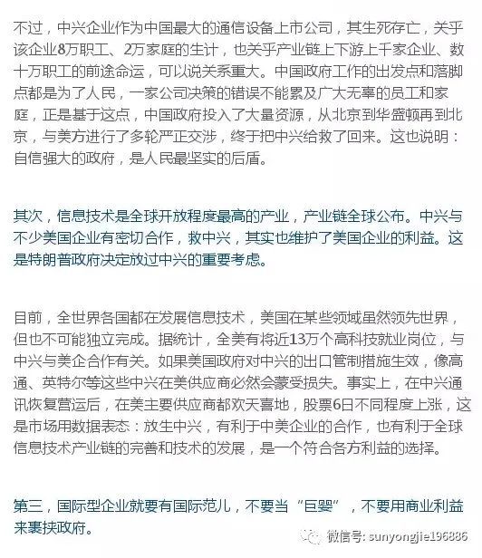 在我们看来,本文作者认为,这是最重要的表达。其核心在于,我们的政府继续以人民的利益为指针,为此我们赞扬。这不是拯救裸体公司的问题庞大的工作人员是公司的核心。政府应该受到新闻媒体的感谢。而不是中兴通讯),试问,一些当时在任的顶尖执行官行不法之事时,你知不知道你的雇员和合伙人 会因此面临什么样的挑战?你相信政府会支持你吗?