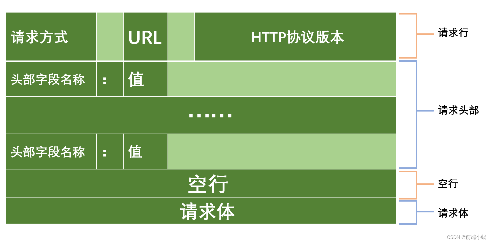 HTTP请求分为四个部分:请求行、请求头、空行和请求体,如图所示: