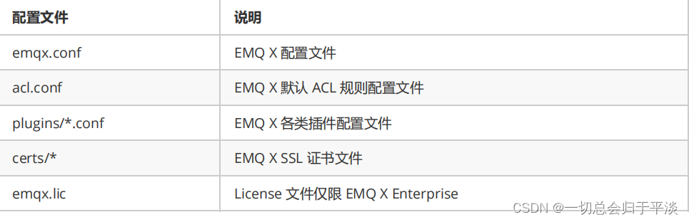 EMQ X 配置文件通常被命名为. conf。 这些配置文件可以在等目录中作为后缀找到。 主要配置文件如下: