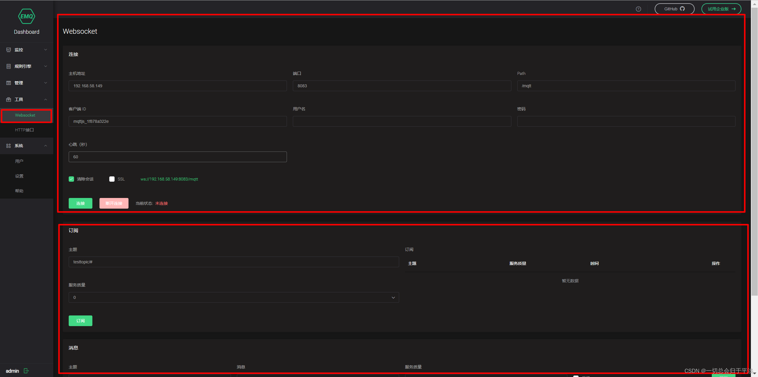 Dashboard ToOLS菜单中的网页提供了由EMQ X Broker提供的基本但有效的 WebSocket客户工具。它具有连接、订阅和出版的功能。它还允许您查看它提供和收到的数据。我们预计,它将协助你更快地完成特定情景或功能测试: