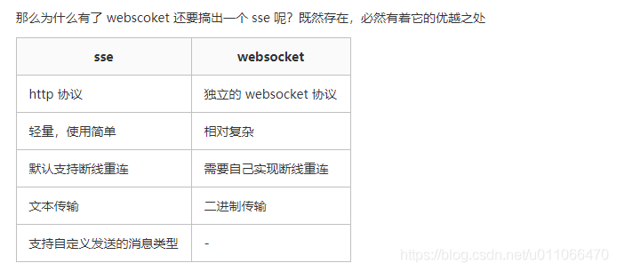 sse 是单通道,信件只能发送给依赖于此服务的客户端; WebSocket 是一个双向通道。此外,与 Websocket 相比,只能单工通信,建立连接后,只能从服务处寄给客户。且占用一个连接,如果您需要客户与服务进行沟通,您可以使用该服务。需额外打开一个连接