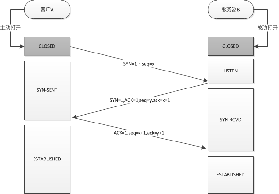 - 当通过 ACK 收到连接确认请求时, ACK 输入 1 的识别号 = y+1, 后方=x+1, 输入已建立( 已连接), 最后 B 输入 。