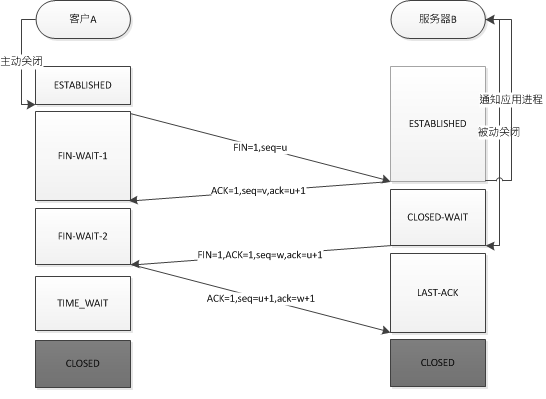 - 收到FIN后,A进入Time_WAIT位置,然后向B发送ACK,确认序列号为收据+1。 B随后进入CLOSED状态,四波波完成。
