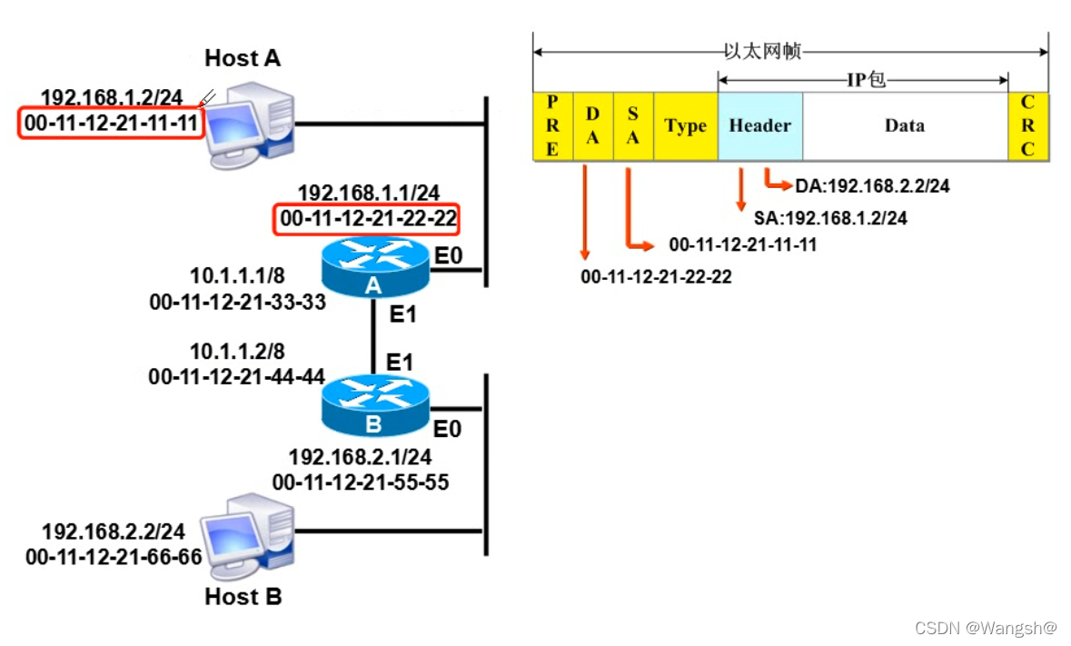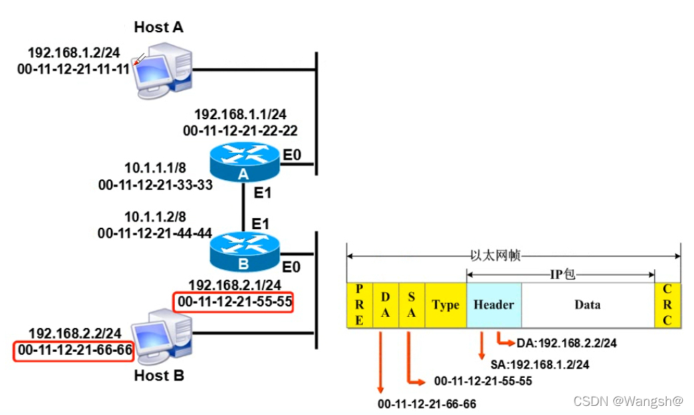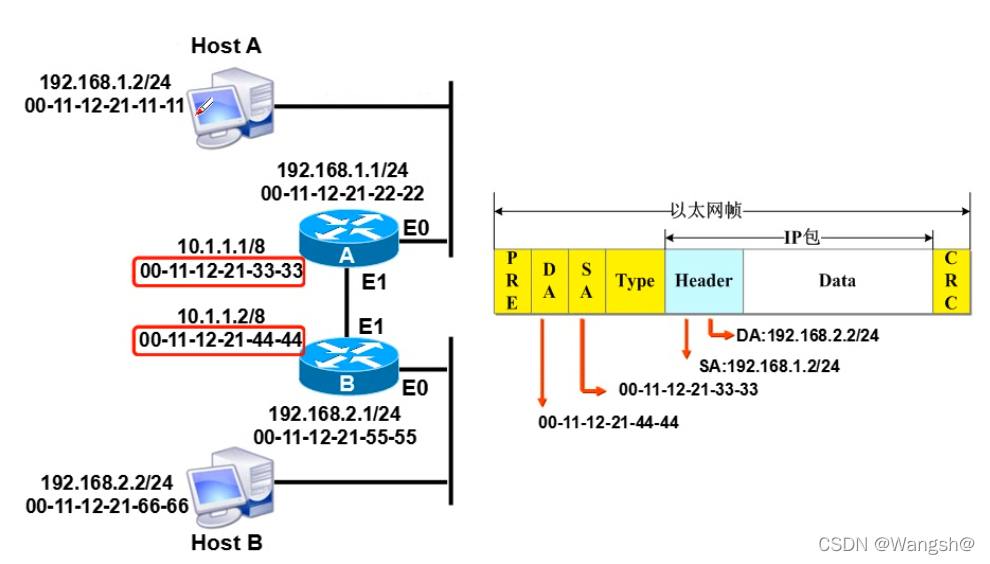 这是当源的 Mac 地址被更改为 e1 mac 地址时 。因为路由器A含有静态路线路由器B的飞跃后被定为E1因此,目标mac地址成为路由器B的e1地址。路由器A向路由器B发送数据。(IP地址不变)