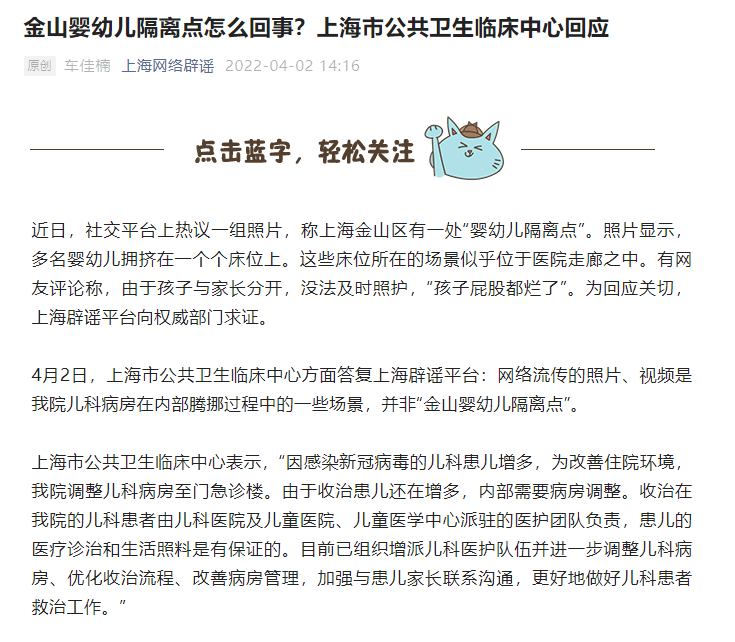 根据「上海网络谣言」, 社群网络平台上的一系列图像最近发现上海金山「儿童隔离地」,