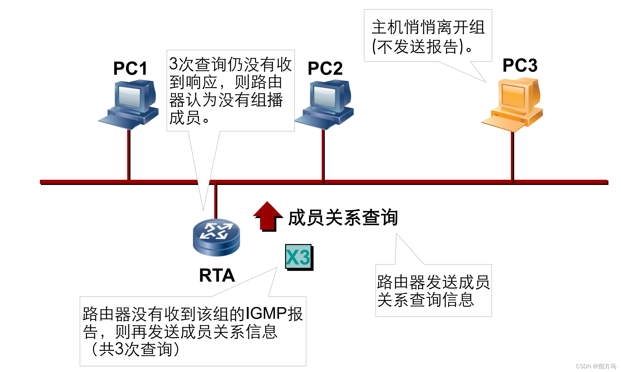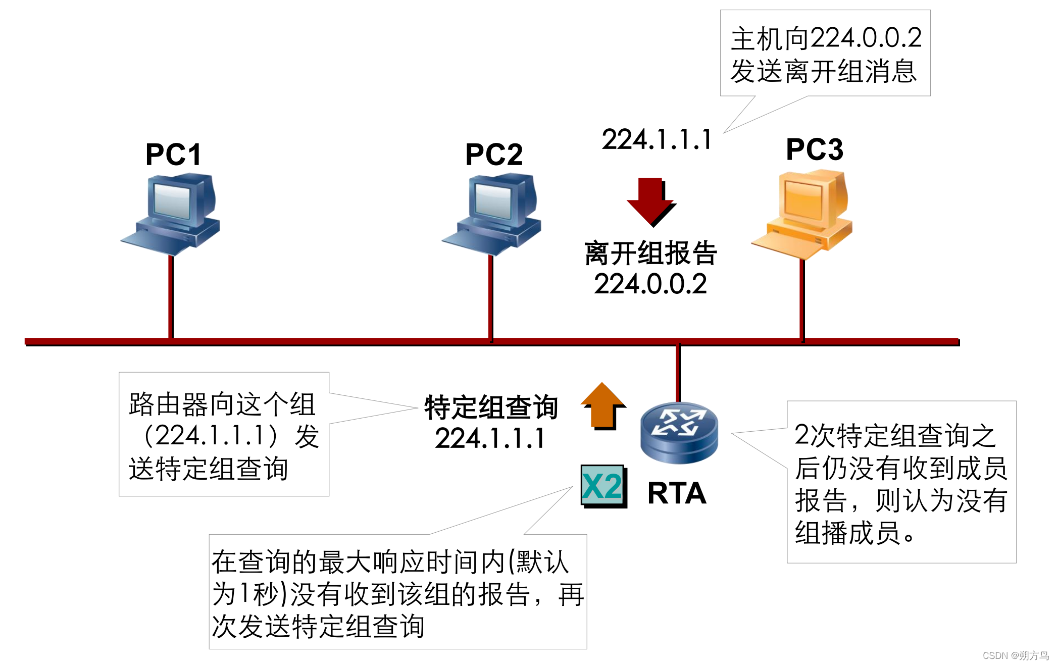 2 如果IGMP查询器连续三个查询周期没有收到离任主机的成员关系报告,则主机被认为不存在,该组成员被销毁。