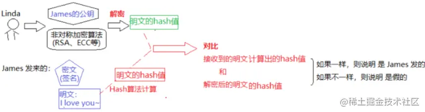 步骤2:Linda的申请James的公钥如果明确的散列值是由James发送的,则根据收到的所需散列值进行解密和解码。