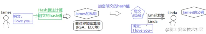 第1步:詹姆斯,请使用James的私钥加密所提供的散列值, 并传输密码( 签名) 以及指定的散列值 。
