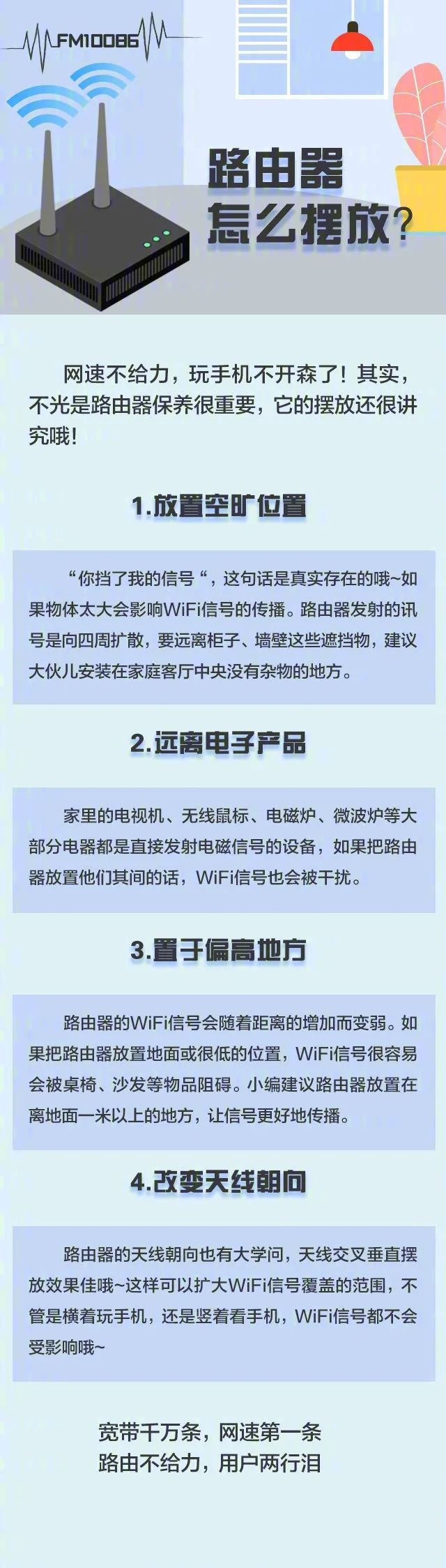 1. 空着位置: "你挡住了我的信号",这是对的。 "如果物品大会影响无线Fi信号传输。 " 路由器的信号环绕周界,远离衣柜和墙壁,建议每个人都设在没有杂货的家居客厅中间。
