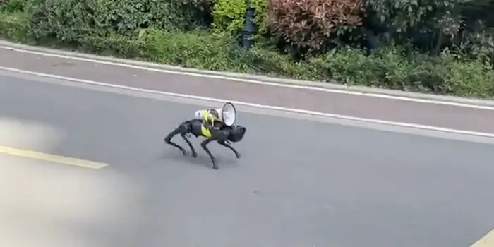 10. 一辆机器狗在上海街头巡逻,发布新的疫苗安全指示,机器人狗与扬声器连在一起,向民众报告:“戴上面具,洗手,检查身体温度。”