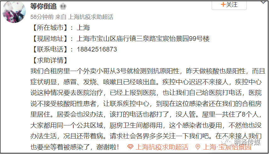 2022年4月5日, 2244, 一位微博客朋友等你转过身去寻求援助:我们共同房间的外出人之一被发现从第3号发现抗原呈阳性, 前天有核酸也呈阳性, 有感冒、发烧、咳嗽、咳嗽、咳嗽、咳嗽、咳嗽等症状。