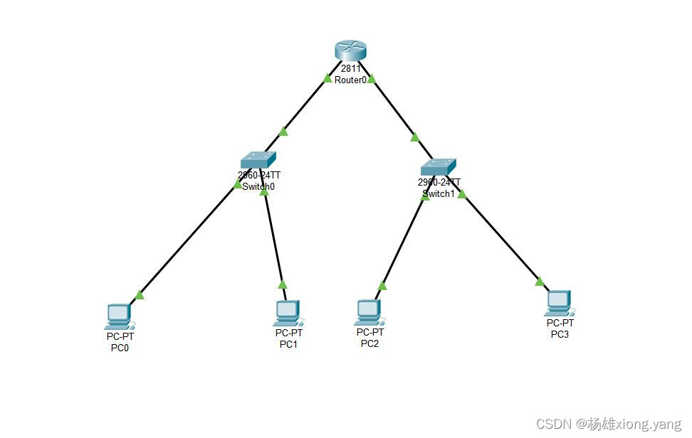 1个路由器连接到2个开关,每个开关连接到2个个人电脑,使4个个人电脑能够相互交流。