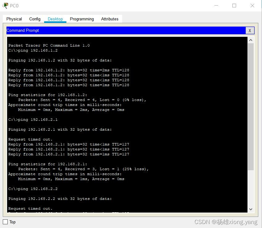 实验取得了成功,一个路由器连接了两个开关,每个开关连接了两个个人电脑,四个个人电脑相互呼应。
