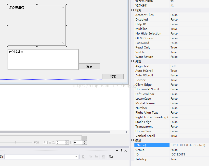 2 在对话框中添加两个编辑框,并添加一个用于发送数据的按钮,一个用于发送编辑框,一个用于接收信件,编辑框用于接收信件,其配置如下: