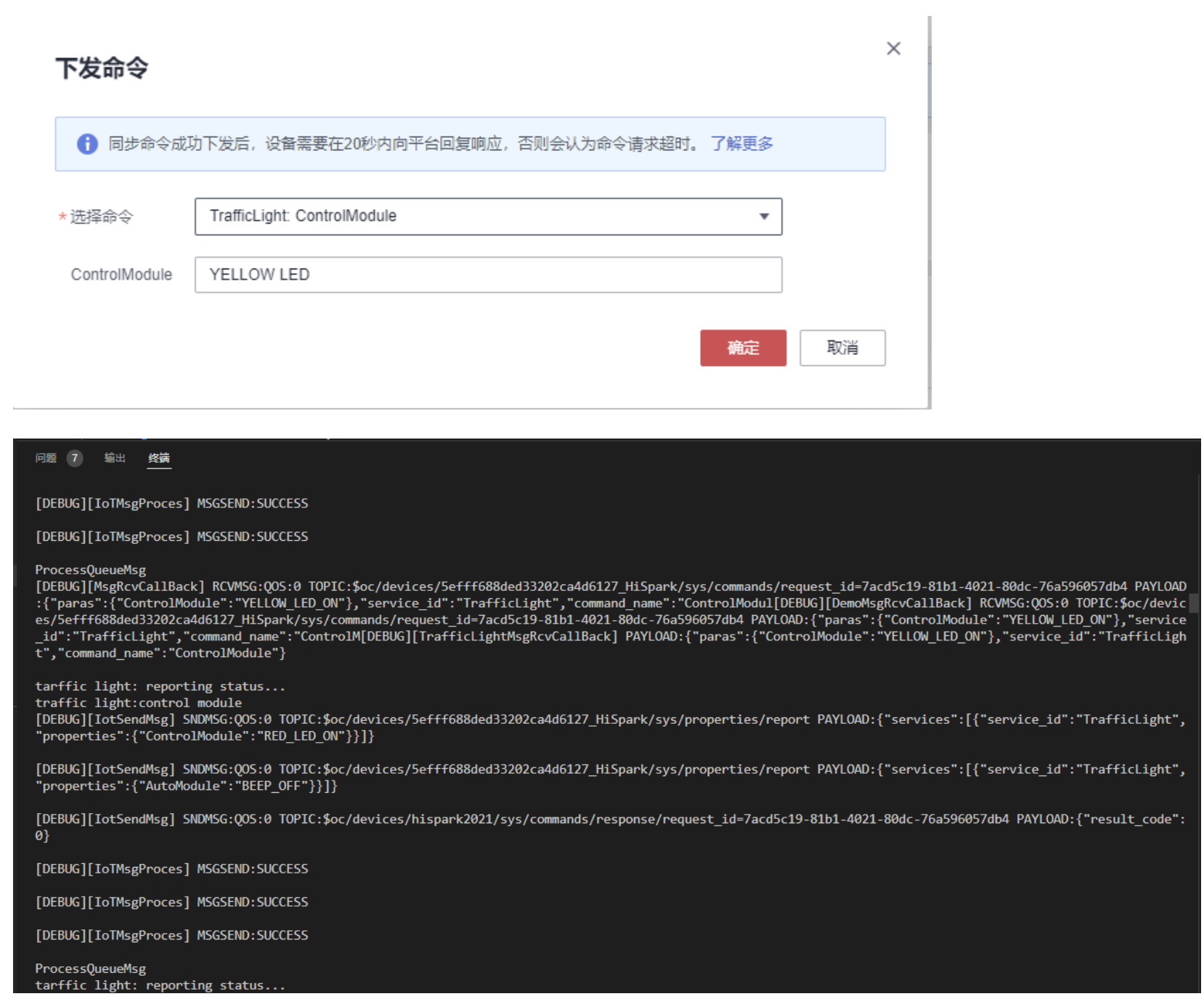 设备->命令栏->同步命令下发->选择创建的命令属性->填入参数,这里下发“YELLOW_LED_ON”为例,下发成功后,板端会从红灯变为绿灯,设备同时串口会有如下打印。如下图所示。