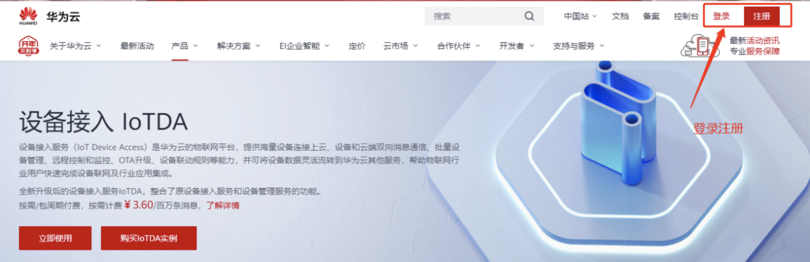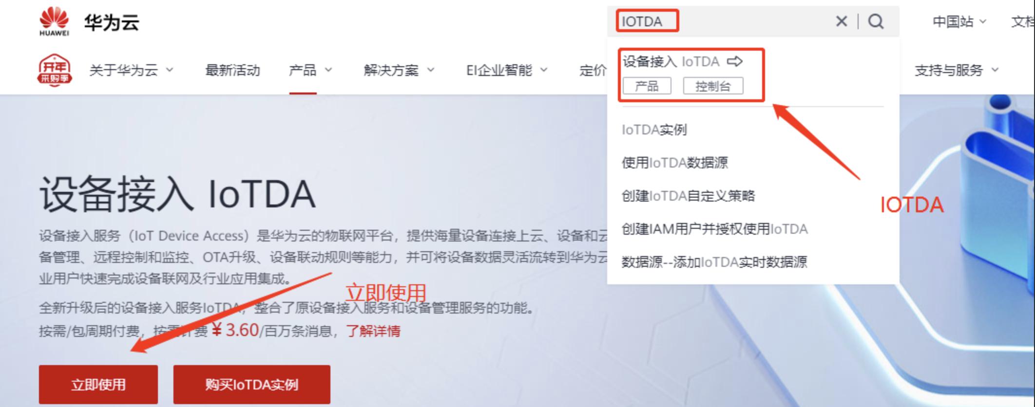 2.2 着陆后,在搜索框中键入“IOTDA”,从弹出菜单中选择“Device access IOTDA”,然后选择“立即使用或免费测试”。