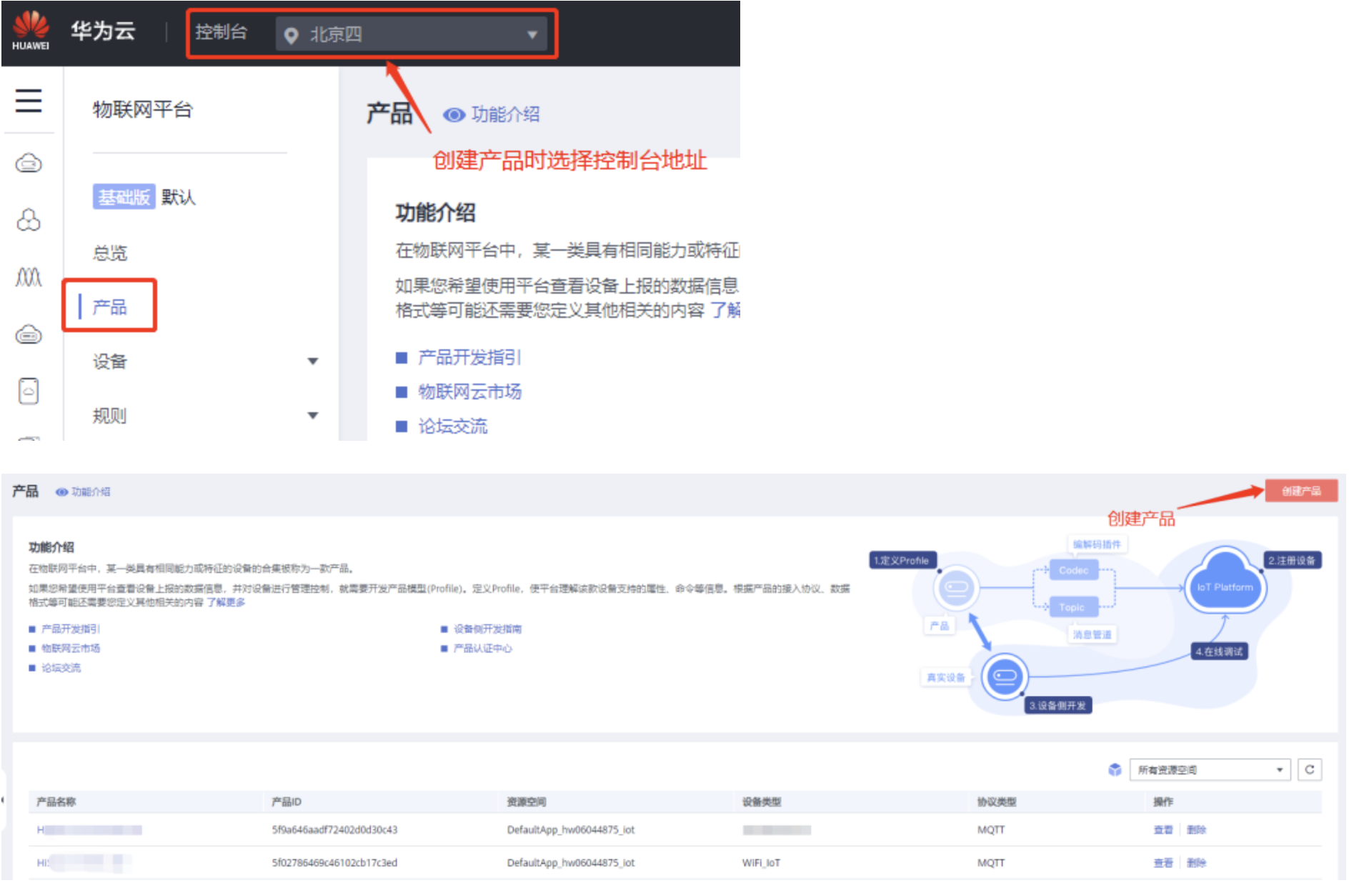 2.3 要创建产品和相关属性,请点击左页任务栏中的 " 产品 " 按钮,将控制表选为 " 北京四 ",然后单击右上角的 " 创建产品 " 按钮(产品名称可以定制)。