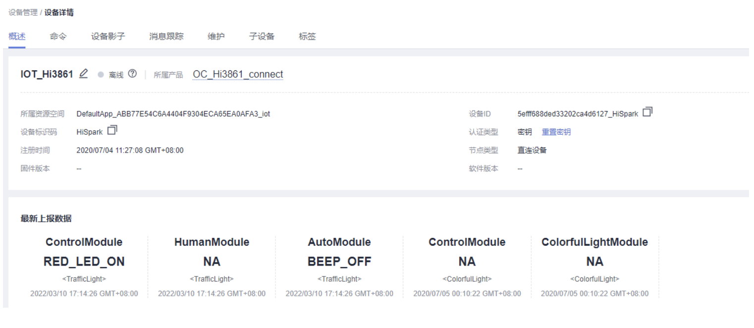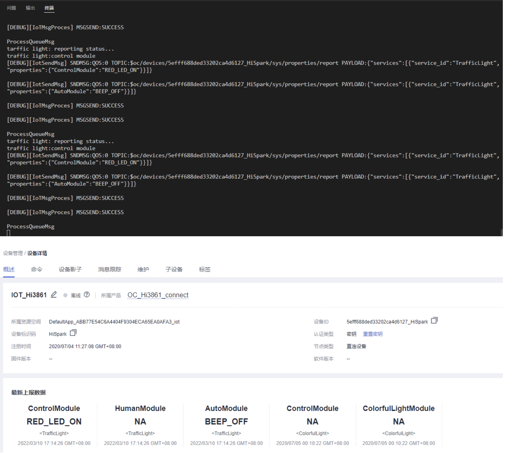 - 燃烧完成后, Hi3861 核心板上的重新定位键将再次按下, 等待开发委员会的wifi 连接建立。 连接建立后, 云层设备将上线, 并且设备将开始向云中发送最新的数据栏, 在序列条目上打印以下指纹, 如以下图像所示 。