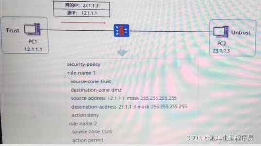 解析:PC1至PC2从托管区域到不信任区域,因此报告与规则2相符,因为它是授权的,防火墙转发信息。