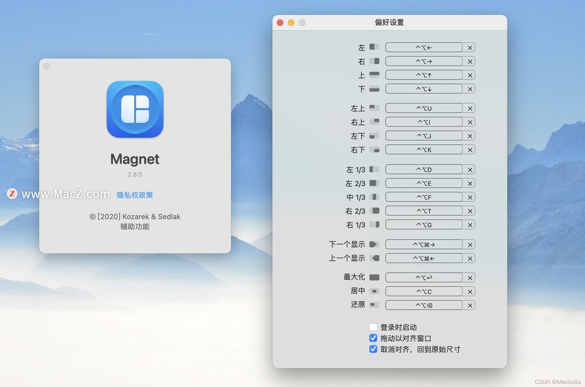 自定义键盘快捷键通过拖动激活,或者磁铁通过将窗口匹配到菜单栏中的有组织砖块来移除屏幕。复制、比较和多任务。