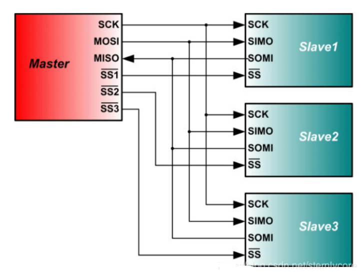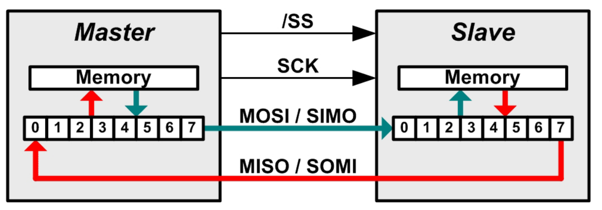 SPI 模式是相同的, 只要四条信号线被适当连接。 拉下 CS/SS 信号线, 即直接通信, 一个字节传输, 读写数据同时, 即 SPI 。