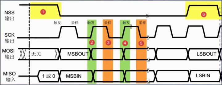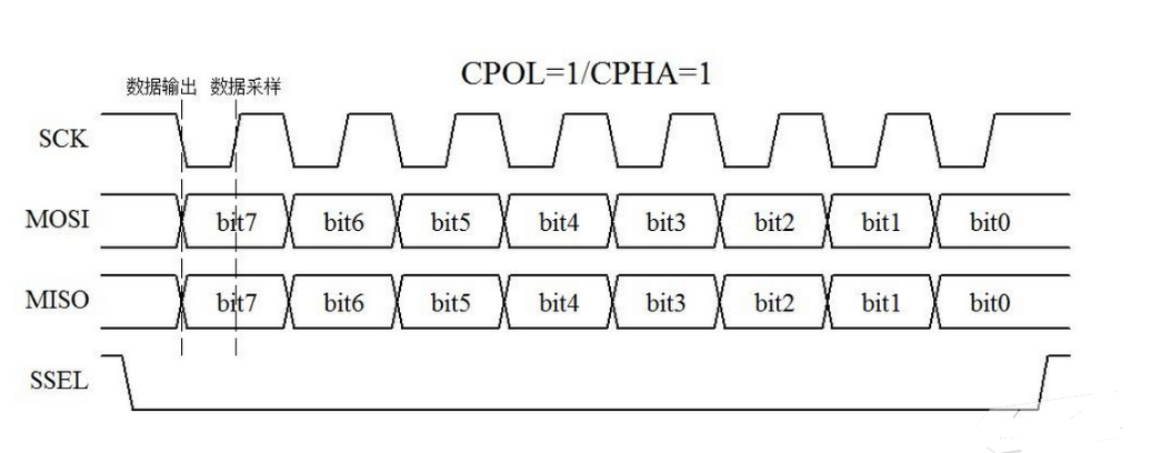 Mode3CPOL=1,CPHA=1:在闲置状态期间,SCLK处于高水平,数据沿第一边缘传输,即SCLK从高水平向低水平的移动,因此数据收集和数据发送增加。