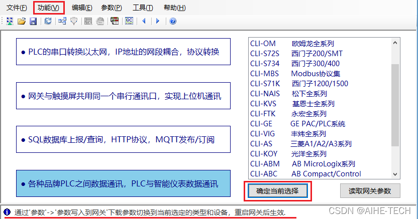 首先打开参数设置软件( 软件下载 )的'功能'->'类型与设备选择'页面,左边选择第四项后点'确认当前选择',如下图,根据提示下载参数重启网关模块。