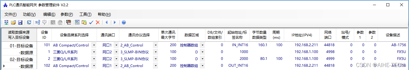 通过'功能'->'网口参数编辑'设置网关模块自身的IP地址等网络参数,再通过'功能'->'PLC之间通讯'进入PLC之间通讯的数据配置页面,配置的Rockwell(AB)和三菱FX5U设备之间的通信数据设置如下: