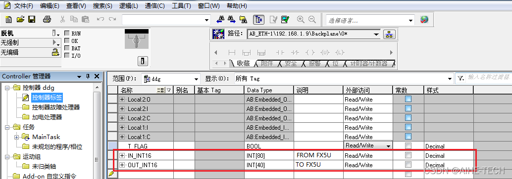 在上述数字中,有两项通信任务:01是FX5U D1 00D1079读取的160字节(D1 00D1079),02是FX5U D1 00读取的160字节(D1 00D1079)。 02是FX5U D1 00读取的160字节(D1 00D1079)。在读取 Rockwell PLC的Out_INT16阵列中,02是80字节;在IN_INT16阵列中,写给Rockwell PLC;从D200开始的80字节被送往FX5U(D200D2039)。