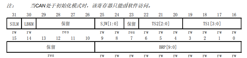 Tbs1、Tbs2和Tsjw是用于确定频率、直接控制罐头港口速率和也可以设定CAN工作模式的极端符号参数。 (Hardware 强制将比特保留为零。 )