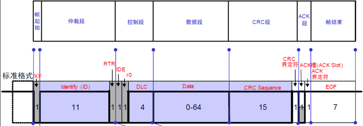 CAN通讯中最重要和最复杂的项目之一是数据框架。它从最显眼的地方(逻辑0)开始。以七个连续的隐藏地点完成(逻辑1)。在它们之间,它分为以下几节:仲裁、控制、数据、《儿童权利公约》和《反致公约》。以标准数据帧为例。